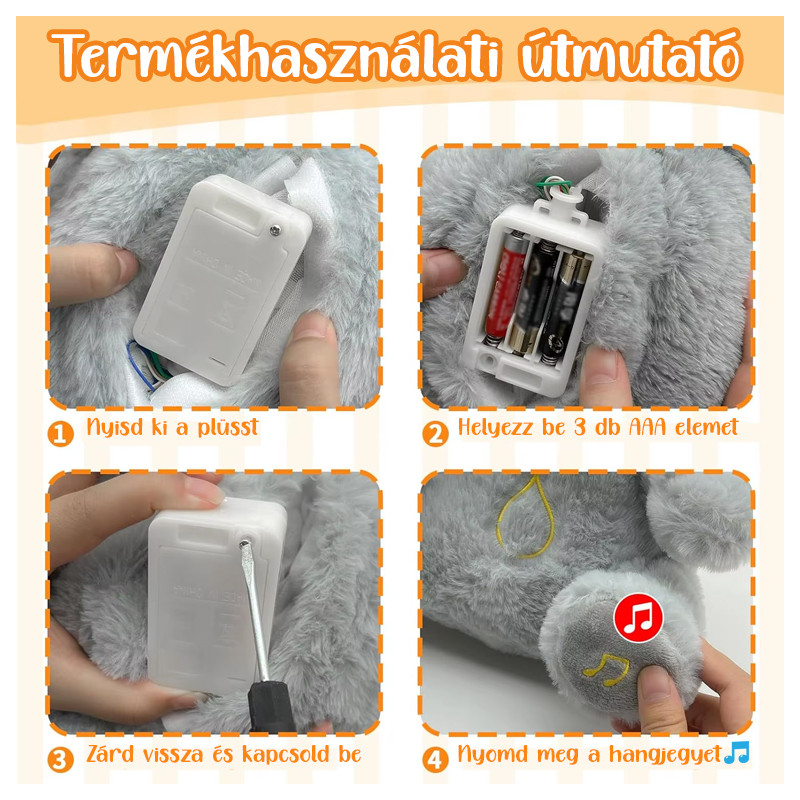 A plüss minden funkciója halk és megnyugtató, hogy ne zavarja az alvást. Az éjszakai fény nem erős, épp csak annyi, hogy a gyermek ne érezze magát egyedül a sötétben.