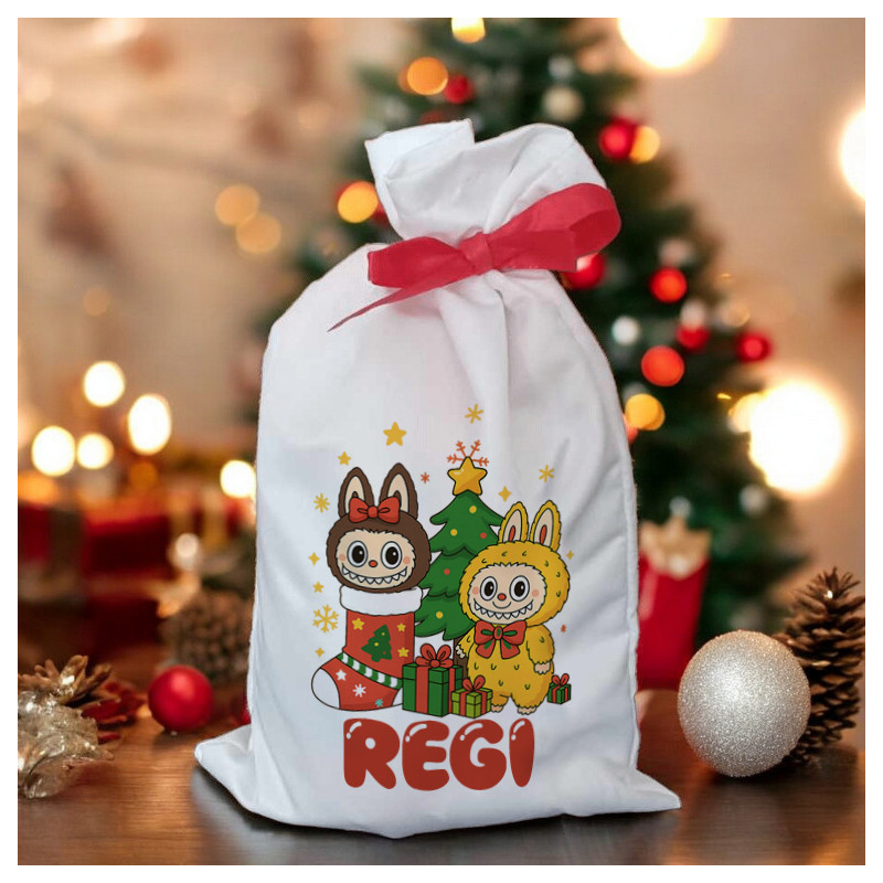 Aranyos karácsonyi Labubu mikulászsák, amelyre a gyerek neve is rákerül. 20×30 cm-es, praktikus méretű mikizsák, tökéletes ajándékcsomagolás december 6-ra, vagy karácsonyra.