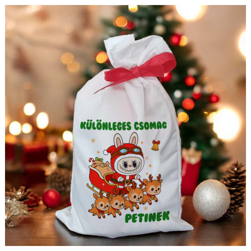Aranyos Labubu mikulászsák, amelyre a gyerek neve is rákerül. 20×30 cm-es, praktikus méretű mikizsák, tökéletes ajándékcsomagolás december 6-ra.